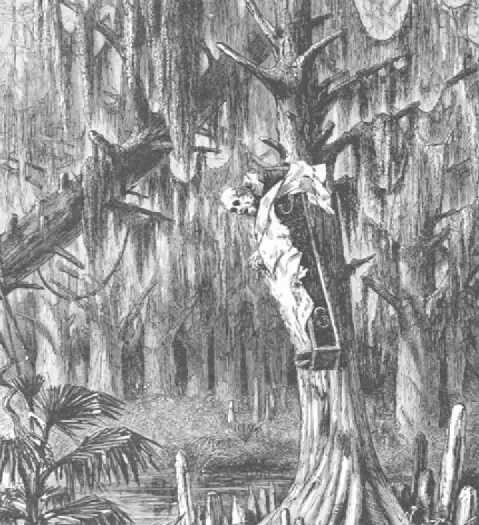 这里的水流更急、更深。流水上方有一口固定在树上的棺材,棺材里的人在挣扎。这其实是一只吸血鬼,流水让它无法离开,久远前被格·瓦内用一根不动岩钉钉死在树上。棺材里有成百上千的鸟类骨头,500GP,一把能切开所有树木的斧头以及150尺长的无法损坏魔绳。给它血吸食,它会回答问题。